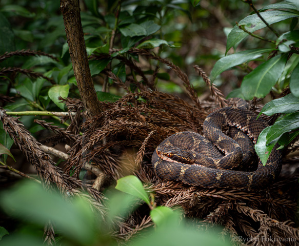 図4:森林の落ち葉の上でとぐろを巻くニホンマムシ