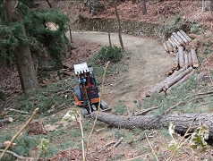 本試験地では、多くの外国産マツ(以下、マツという)を育成していますが、一部のマツは風倒等で現存数が少なくなっており、見本林として維持することが困難となっているエリアがあります。そこで、里山創生プロジェクトの一環として、2024年度からコナラやクヌギなどの苗木を植栽し、里山林への樹種転換を開始しました。2026年3月には、昨年度に引き続き、新たにこれらの苗木を植栽するイベントを予定しており、植栽エリアの確保を目的に、支障となるマツを同年1月から2月にかけて伐採しました。伐採したマツは計16本で、その胸高直径(以下、直径という)は平均41cm、樹高は推定で平均21mあり、安全に伐倒するためには技術力が求められます。直径の大きい個体や傾斜木は、チェーンソーに加え牽引具などを併用し、技術向上のため職員が交代で伐倒しました。伐採後は、重機に付属するウィンチで幹や枝葉を集積し、地拵えを行いました。幹材は実習等で行う薪割り体験や燃料等に利用する予定です。